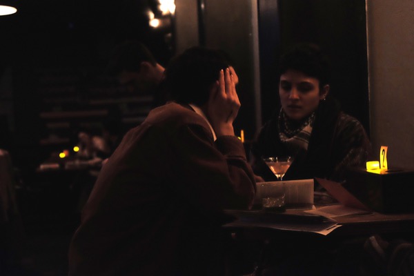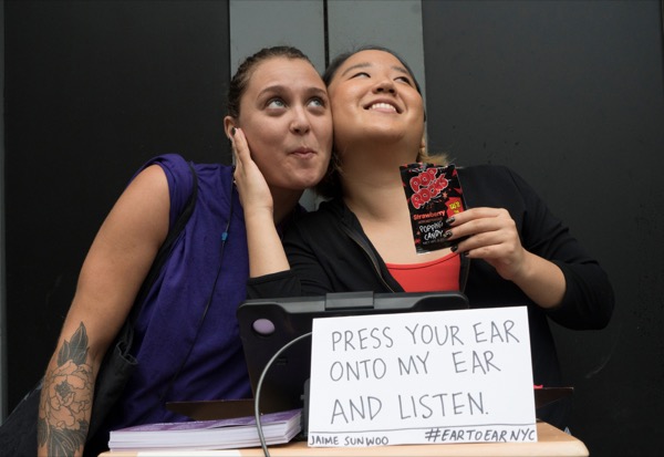 With ears pressed together, people listen to each other's inner sounds while taking turns eating different textured foods.