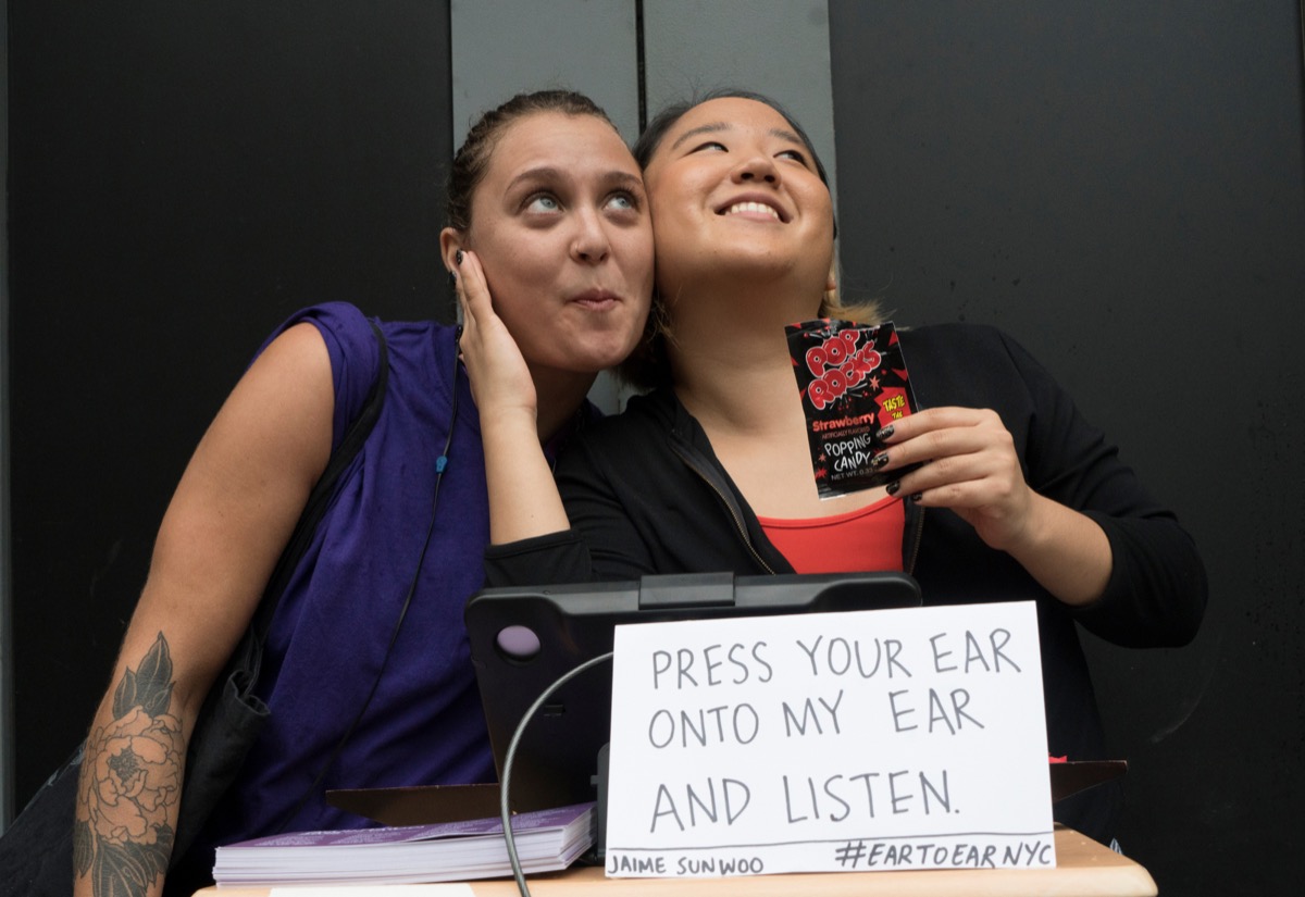Ear to Ear is an attempt to see 'eye to eye' with others. To protect ourselves, we normally guard our senses around strangers. Strangers lack our trust and intimacy so we tend to avoid eye contact, are quieter, and certainly do not touch. Ear to Ear is a celebratory act to share the senses with someone you are willing to trust just for a moment. Over eighty people participated in the project during the Art in Odd Places Festival 2018. Videos of the encounters were uploaded on Instagram under #EartoEarNYC.