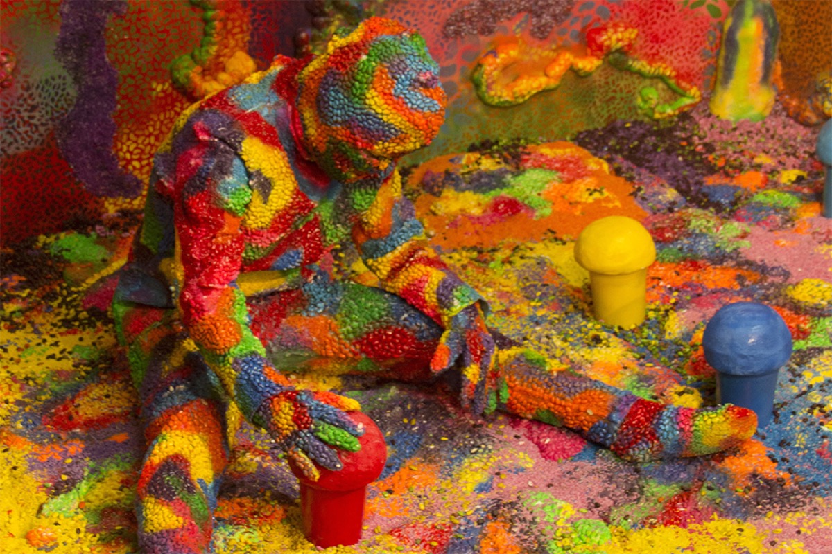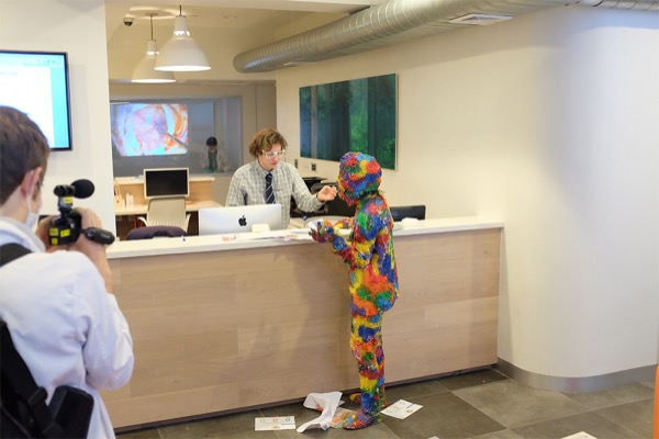 In this two-part performance and installation, a researcher at a biochemistry lab becomes infected with an unknown fungal disease, transforming into a restless, impulsive, mischievous Creature. A team of medical professionals monitor its whereabouts, warn passersby of the dangerous disease, and showcase a public health campaign at a medical clinic. They try to quarantine The Creature inside the clinic, but fail due to bureaucratic setbacks.